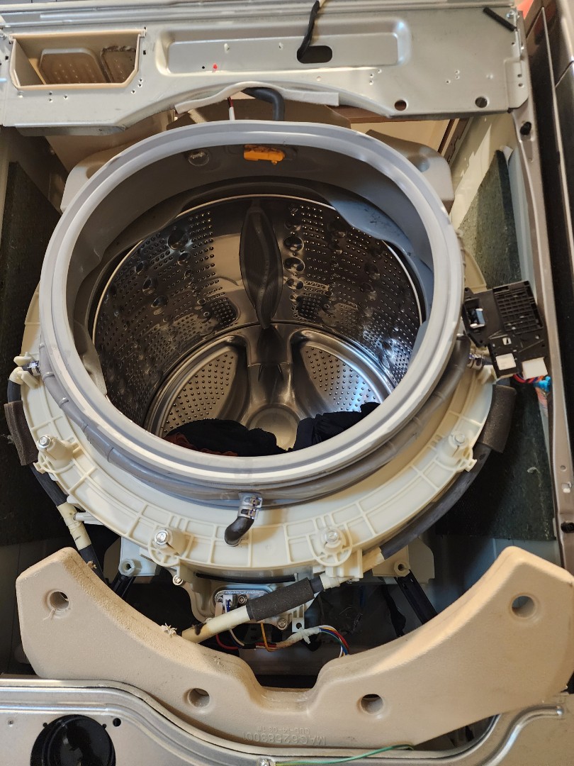 Upon inspection of the LG front load washer, it was evident that the machine exhibited erratic operation and a leak during use. Upon further investigation, I discovered that the lower counterweight had detached from the tub, causing damage to a hose. I carefully reinstalled the counterweight, ensuring it was securely fastened to the tub. Additionally, I replaced the damaged hose to prevent any future leaks. After completing these repairs, the washer operated smoothly and without leaks. Trilogy in Rio Verde.